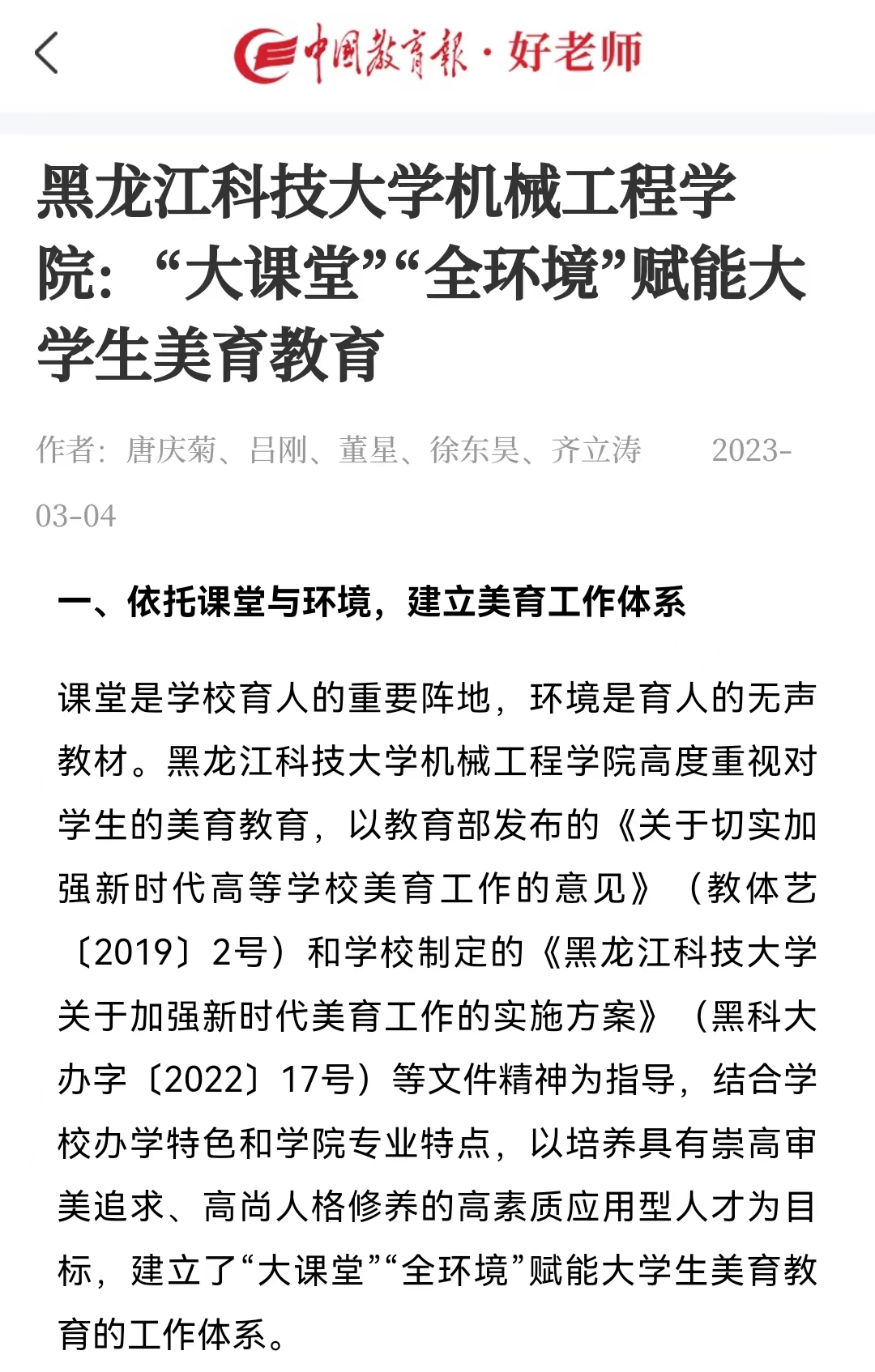 课堂是公司育人的重要阵地,环境是育人的无声教材。unibet高度重视对员工的美育教育,以教育部发布的《关于切实加强新时代高等公司美育工作的意见》(教体艺〔2019〕2号)和公司制定的《unibet中文关于加强新时代美育工作的实施方案》(黑科大办字〔2022〕17号)等文件精神为指导,结合公司办学特色和公司专业特点,以培养具有崇高审美追求、高尚人格修养的高素质应用型人才为目标,建立了“大课堂”“全环境”赋能老员工美育教育的工作体系。