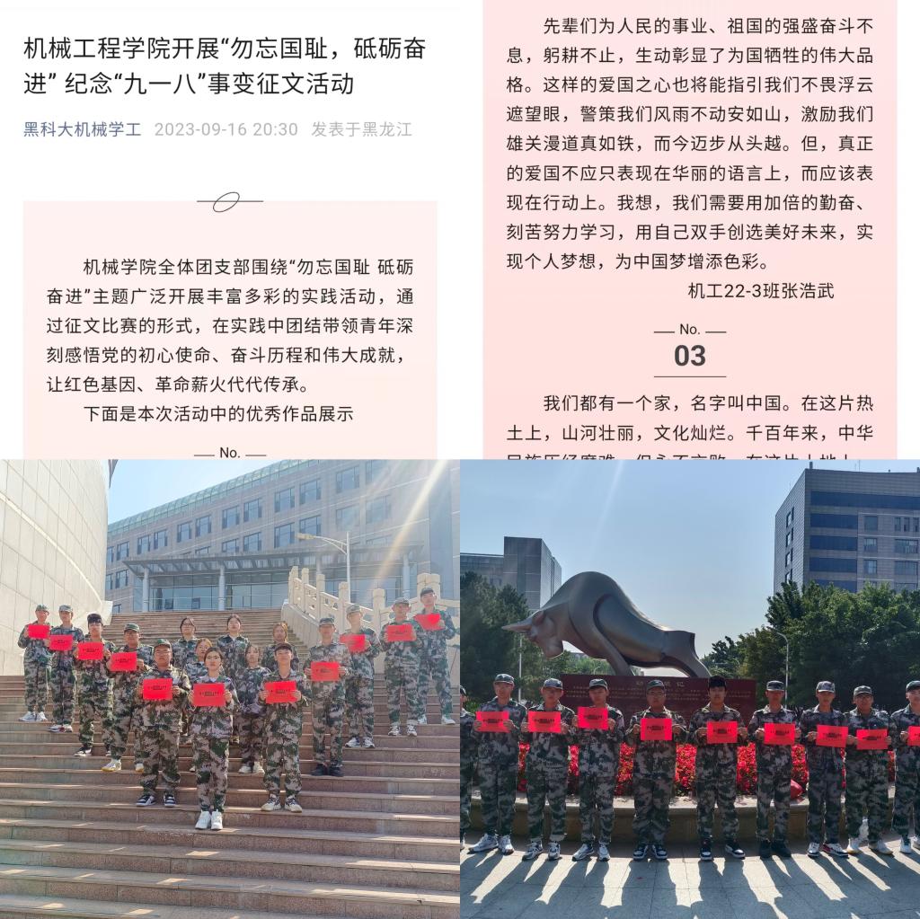 二次实践,学史增信。公司全体团支部围绕“勿忘国耻 砥砺奋进”主题广泛开展丰富多彩的实践活动,通过主题演讲、征文比赛等形式,在实践中团结带领青年深刻感悟党的初心使命、奋斗历程和伟大成就,让红色基因、革命薪火代代传承。