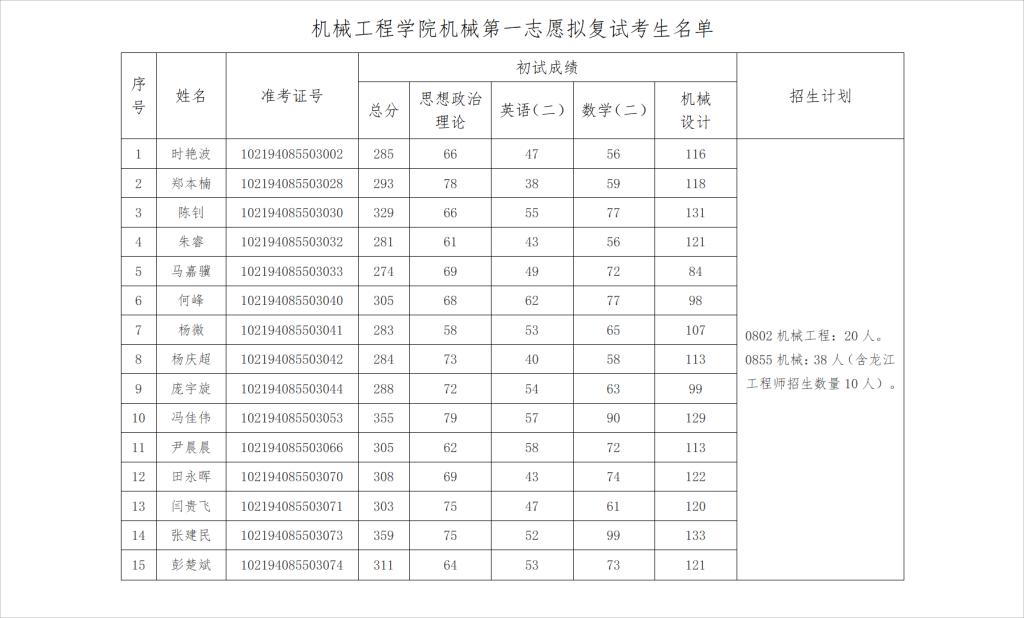 2024年全国硕士研究生招生考试unibet机械专业第一志愿拟复试考生名单