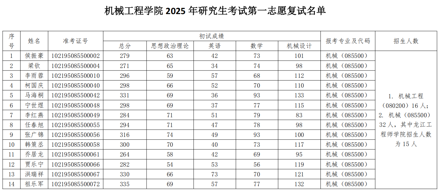 2025年全国硕士研究生招生考试unibet机械一志愿复试成绩公示